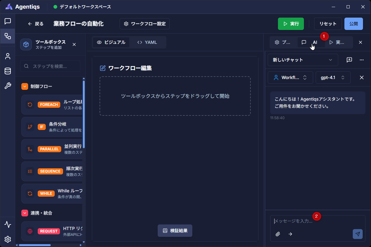 - AIで対話的に作成、編集されたワークフローは、必ず正しく動作するわけではありません。
