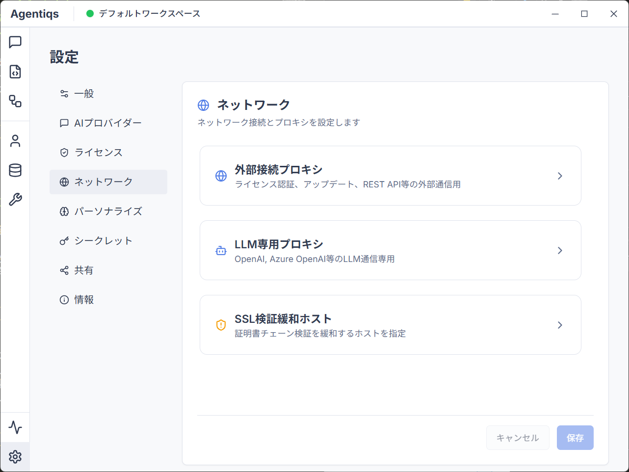 プロキシは外部接続プロキシとLLM専用プロキシの2つを用途に応じて設定できます。