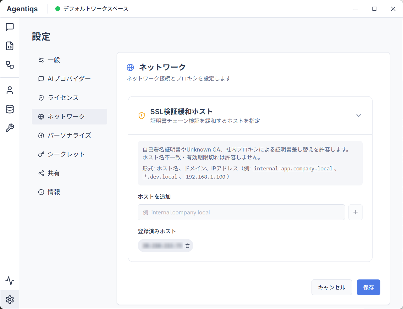 - [設定] > [ネットワーク] > [SSL検証緩和ホスト] > [ホストを追加] に任意のホストを設定します。